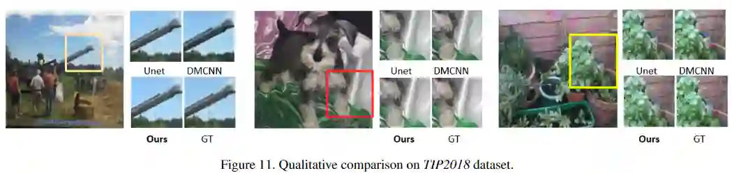 数据集: LCDMoire(Aim 2019 challenge on image demoreing: datasetand study. InICCVW, 2019)、TIP2018( Moire photorestoration using multiresolution convolutional neural net-works.)