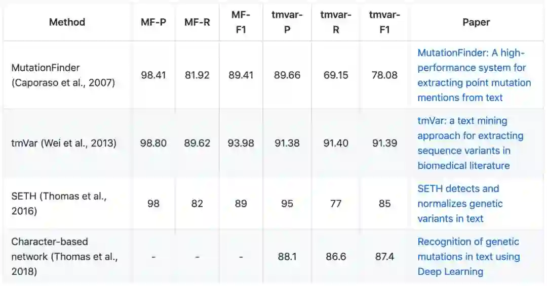 MutationFinder: a high-performance system for extracting point mutation mentions from text. Caporaso J G, Baumgartner Jr W A, Randolph D A, et al. Bioinformatics, 2007, 23(14): 1862-1865.
