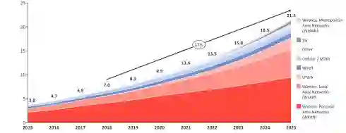 然而市场评估显示,市场正在围绕这些LPWAN技术中的一些技术迅速整合,特别是在非授权频谱的Sigfox和LoRa技术,以及在授权频谱中的NB-IoT和LTE-M。在过去几年中,这4项技术在公共网络部署的数量和速度方面是前所未有的,无论是现有的电信运营商还是小型网络提供商。