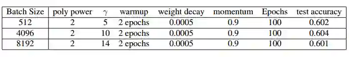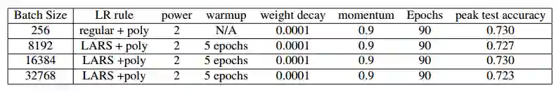 通过使用 LARS,我们能把 ResNet50 模型的 batch 大小扩展到 32K。我们使用 Batch-256 作为基线。在最高准确度上,8K 的 Batch 损失了 0.3% 的准确度,32K 的 Batch 损失了 0.7% 的准确度。我们相信这些准确度损失能够通过超参数调整弥补。我们的基线要比顶级的结果(7)(17)略低,因为我们并未使用数据增强。