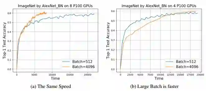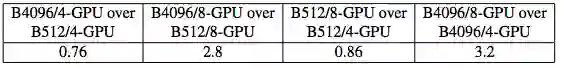 图 5:在 DGX-half(4 块 GPU)上,512 的 Batch 与 4096 的 Batch 有同样的速度。在 DGX(8 块 GPU)上,4096 的 Batch 是 512 Batch 速度的 2.6 倍。因此,大批量在计算能力增强的时候会有收益。