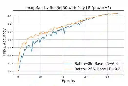 与 facebook 的论文类似,我们使用预热策略(warm-up policy)和线性缩放策略来获取学习率。但是我们和 Facebook 有两点不同:(1)我们将学习率提升得更高,Batch-256 使用的基本学习率是 0.2,而 Batch-8192 使用的基本学习率是 6.4。(2)我们使用多个规则(poly rule)而不是多步规则(multistep rule)来更新学习率。