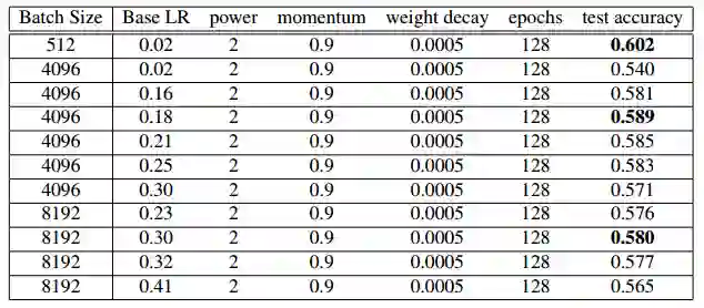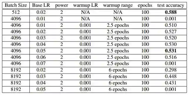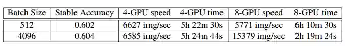 表 2:AlexNet 模型使用多个学习率策略在 ImageNet 数据集中的训练情况。我们使用学习率的线性缩放和预热策略,这些是 Facebook 论文(7)中使用的主要技术。
