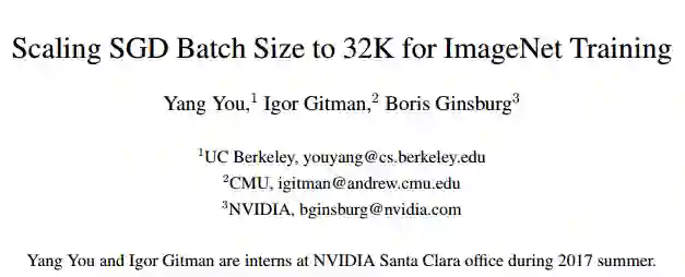 我们关注数据并行化的小批量随机梯度下降训练(4),该算法在许多如 Caffe(5)和 TensorFlow(6)那样的流行深度学习框架中都是顶尖的优化方法。我们在该研究中使用的是英伟达 GPU。为了加速 DNN 的训练,我们需要将算法扩展到更多的处理器中。所以为了将数据平行化的 SGD 方法扩展到更多的处理器中,我们需要增加批量大小。增加 GPU 数量的同时增加批量大小,并能够使每一块 GPU 的工作保持稳定,并能令每块 GPU 的计算资源都得到充分利用。