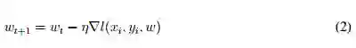 在第 t 次迭代中,我们使用前向和反向传播以求得损失函数对权重的梯度。然后,我们使用这个梯度来更新权重,根据梯度更新权重的方程(2)如下: