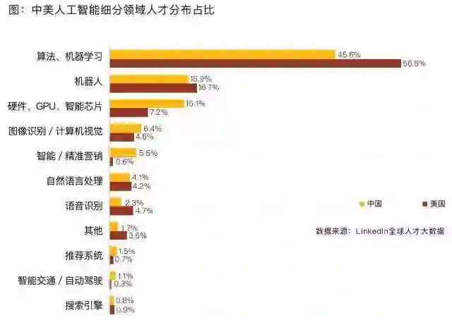 中美两国 AI 人才在不同细分领域的分布则“各擅胜场”:美国的 AI 基础层人才占比超7成,集中度很高,而中国在 AI 技术层和应用层的人才分布则更为广泛,特别是在机器人、图像识别、精准营销和自动驾驶等领域。