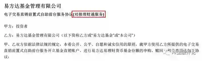 服务协议显示,在腾讯理财通上线的基金是基金公司的电子直销对接理财通服务。据悉这是目前理财通主要销售基金方式,其对接的四只货币基金(易方达易理财,汇添富全额宝,南方现金通E,华夏财富宝)截止到2017年12月31日,其规模合计已为2197.33亿元。