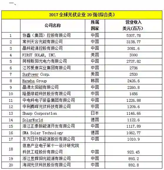 在光伏领域,中国公司已经占据了全球垄断地位,下图是2017年4月365光伏发布的全球光伏20强,这是一个综合性排名,不只是组件,还包括电池片,硅片等,外国公司只有6家,其中美国2家,德国2家,韩国和日本各1家。