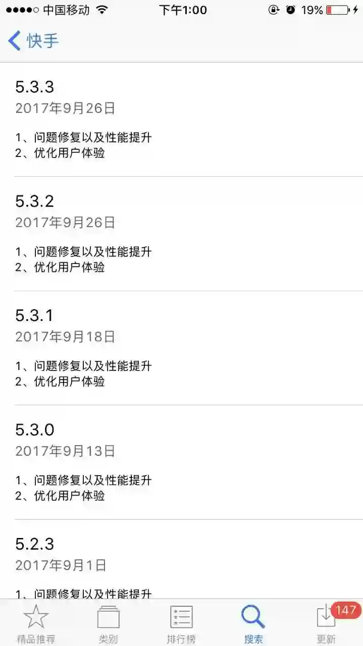 另外,我发现快手的产品表现层上几乎没有任何改动,架构上始终只有三个Tab“关注”、“发现”和“同城”。其在App Store上的版本记录里,每次都只有两点。