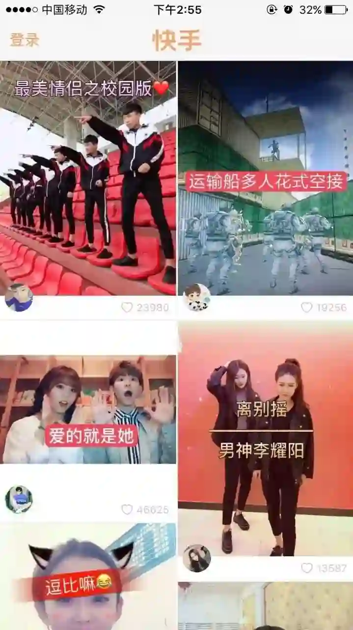 打开快手app,在没有登录的情况下,界面非常简单,没有常见的视频类别,也没有按照视频热度的两个维度,即播放量和红心数的多少设置排行榜单,而是以瀑布流的形式展示内容。可以看到,优先展示的是红心数多的视频,有的红心数上万或上千,少数红心百位数或十位数,但视频却并非按照红心数从高到低排序,看起来完全是随机的。同时考虑视频的新鲜度,从时效性上优先展示的是一天内的视频。