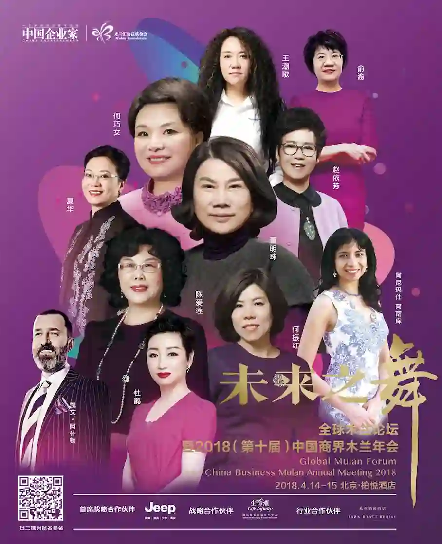 由《中国企业家》杂志社、木兰汇公益基金会联合主办的全球木兰论坛暨2018(第十届)中国商界木兰年会将于4月14日至15日在北京举行,董明珠、何巧女、陈爱莲、赵依芳、夏华、汪静波、俞渝、王潮歌、杜鹃以及物联网之父凯文•阿什顿、亚马逊AWS首席科学家Anima Anandkumar等已确认出席,点击下图报名参会。