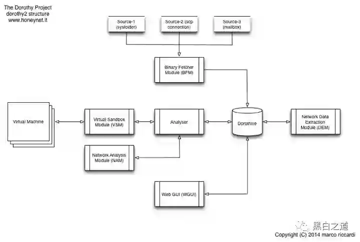 Dorothy2框架主要由五大模块组成,这些模块均可以单独运行。下面这张图片显示的是Dorothy2的框架结构图,其中的各个模块已相互连接: