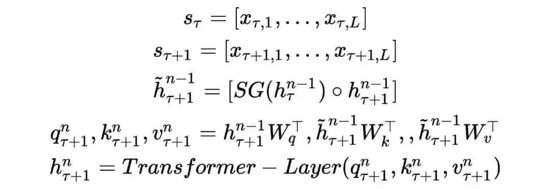 而为了解决这一问题,Transformer-XL 引入了一个 memory 状态,在对当前 segment 进行处理的时候,缓存并利用上一个 segment 中所有 layer 的隐向量序列,综合两个 segment 的信息进行 attention 等操作。为了节约计算资源的开销,上一个 segment 的所有隐层向量只参与前向计算,不进行反向传播,具体计算过程如下:
