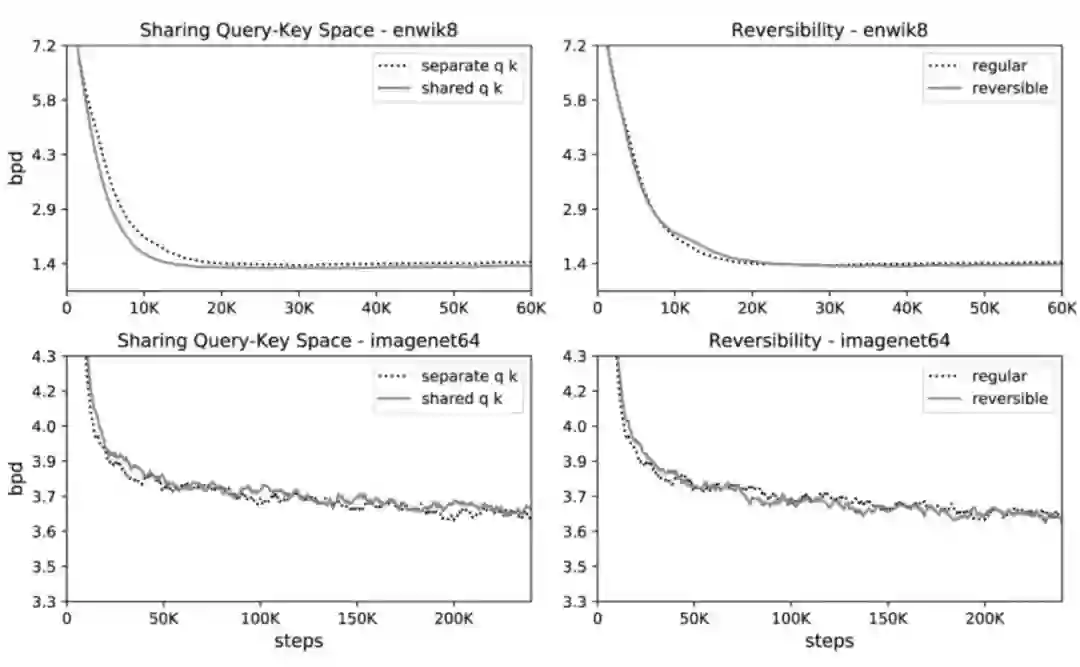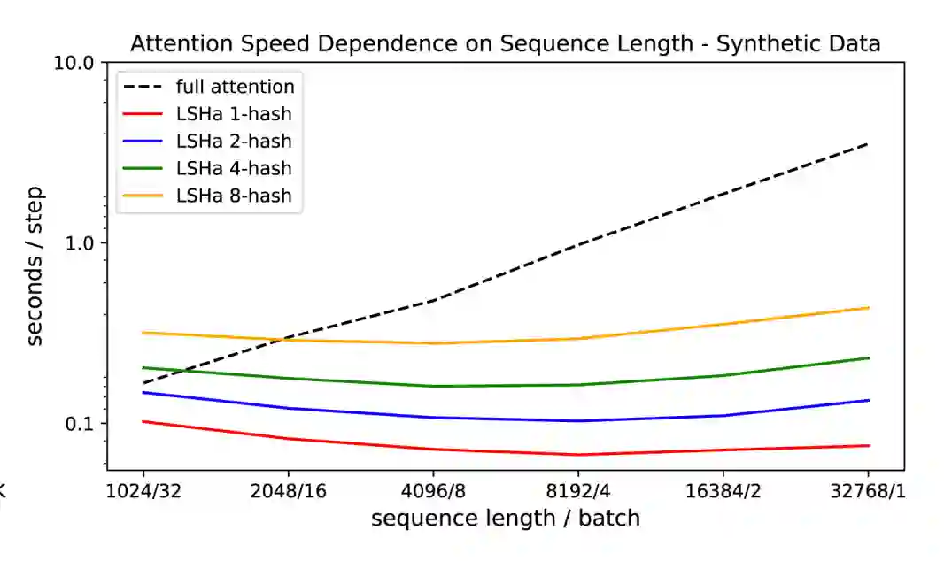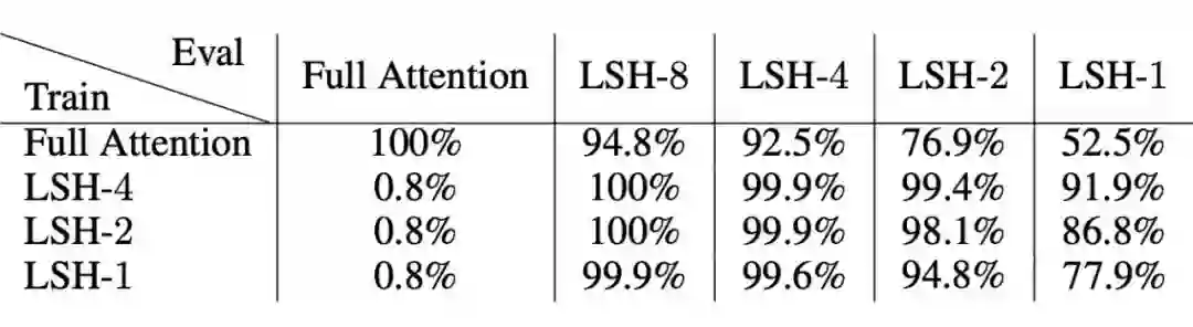 随后论文针对局部哈希 Attention 的优化做了一个很有意思的实验,该实验的任务是重复句子的单词预测,即将两个相同的句子通过特殊字符拼接在一起,以