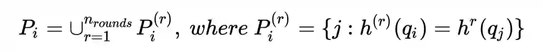 另外,在局部敏感哈希中,随机的次数越多,得到的哈希桶就越准确,所以哈希值可以做多轮。这样,P 就成为多次哈希的值的全集: