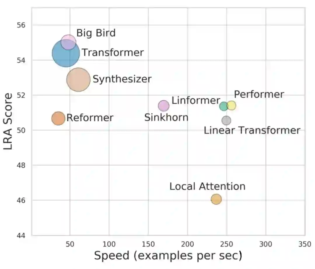 由结果可以大体看出 Linformer、Linear Transformer、Performer 效率很高,Big bird Reformer 效率很低,但是 Big Bird 的性能还是不错的。总体的性能还可以由以下这张图看出,其中纵轴是效果,横轴是速度,圆圈的大小代表所需要的显存。理论上来说,越靠近右上方的模型越好,圆圈越小的模型越好。