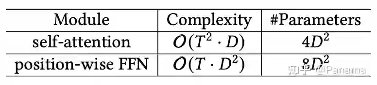 ▲ self-attention 和 FFN 模块复杂度分析,T 代表序列长度,D 表示隐层向量的维度