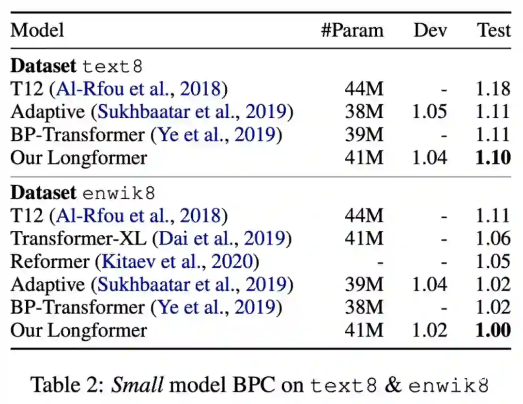 在实验部分,Longformer 首先和之前的模型一样在自回归任务上进行了实验: