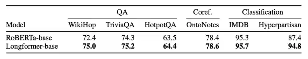 可以看出 Longformer 在下游的任务上的表现基本都超过了 Roberta,而且下游任务的数据集文本越长 Longformer 的优势更为明显。