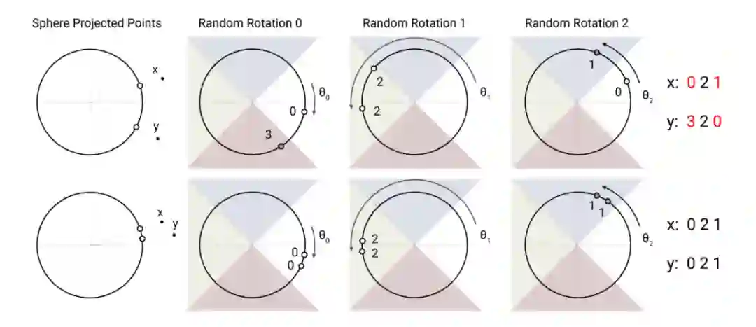 首先我们可以介绍一下局部哈希算法,如下图所示,对于空间中的点,先将其投影到一个圆上,然后将分成八个区域,每个区域都代表一个独立的值。随机转动圆,记录下投影后的点所在区域的值;那么经过多次转动后,就为一个点得到了多个值,这些值就是点的哈希值。