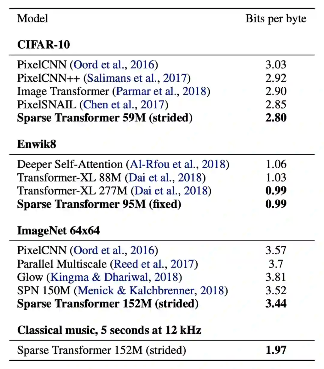 由实验结果还可以看出作者设计的注意力模式确实分别使用于图像和文本。至此为对 Sparse Transformer 关于稀疏注意力部分的简单介绍,该模型提出较早,虽然效果不如后面一些同样基于稀疏注意力的模型,但是其范式的总结对后续模型的发展有着深远的意义。