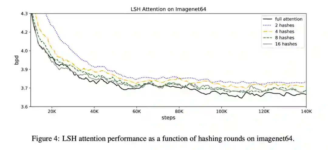 的格式作为序列输入,每次通过前一个句子预测后面一个句子。其使用了一个单层的 Transformer 模型,通过训练和测试时不同轮数的局部哈希进行了效果对比,实验结果如下