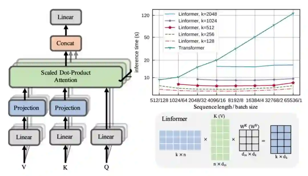 由公式和模型图均可知 Linformer 在 V 和 K 参与 Self-Attention 计算之前,通过两个投影矩阵将其序列长度那一维降至一个固定值,因此无论原始序列的输入长度是多少,最后均会变成一个 k 长度的向量,最后 Self-Attention 的时间复杂度也会变成线性复杂度。