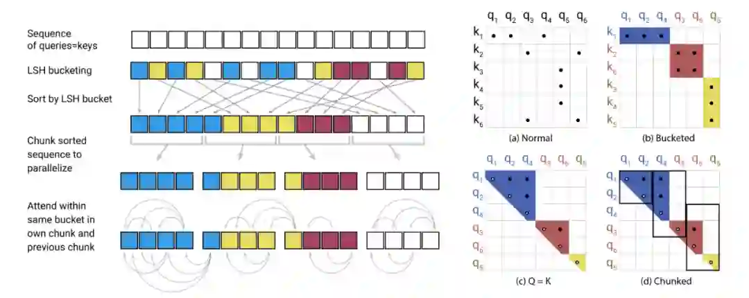 啧表示当前字符注意的区域,这里规定为当前字符的 query 的哈希值和序列中 key 的哈希值相同的位置进行 Attention 操作。经过这些定义,我们可以将原序列按哈希值进行排序,并分为