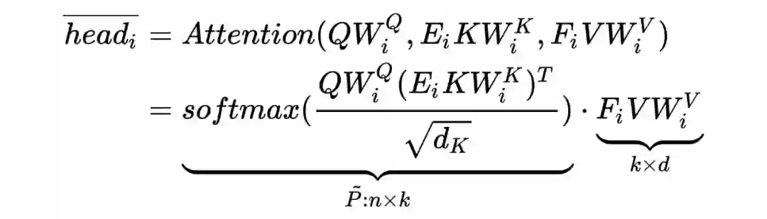 作者在论文中花了很多篇幅证明降维的合理性,在这里我们不过多赘述,感兴趣的读者可以自行阅读原文。根据以上的结论,我们很容易想到在训练和测试的过程对 K、V 的矩阵进行 SVD 分解就能够解决效率问题,但实际上再测试过程中进行 SVD 分解还是比较麻烦,因此论文中给出了一种十分简单粗暴的方式来代替这一步骤:直接给 key 和 value 矩阵加一层线性变换,将其的长度变为一个定值,其模型结构如下所示: