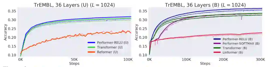 Performer 也在一些任务上进行了测评,也是一些长序列相关的任务,我们可以简单了解一下其大致性能: