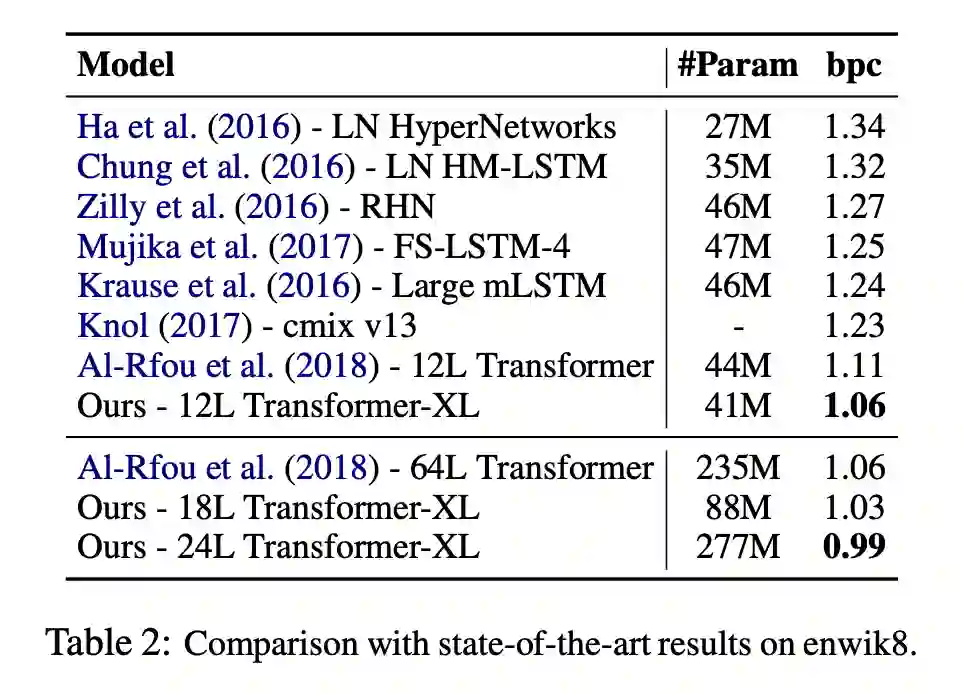 在原论文中作者使用字符级的语言模型任务对 Transformer-XL 进行了评估,与当时的一些基线模型相比取得了最优的结果: