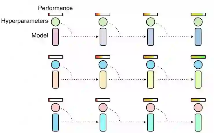 如同随机搜索一样,PBT首先也会并行训练多个神经网络与随机超参,但是每一个网络不是独立训练的,而是使用来自其他群体的信息来完善超参数,并将计算资源引导到更有优秀的模型。这以算法灵感来自于于遗传算法,每个群体成员都被称为“工人”,并可以利用其余群体成员的信息,如从另一个性能较好的“工人”中复制模型参数,此外,它还可以通过随机更改当前值来探索新的超参数。