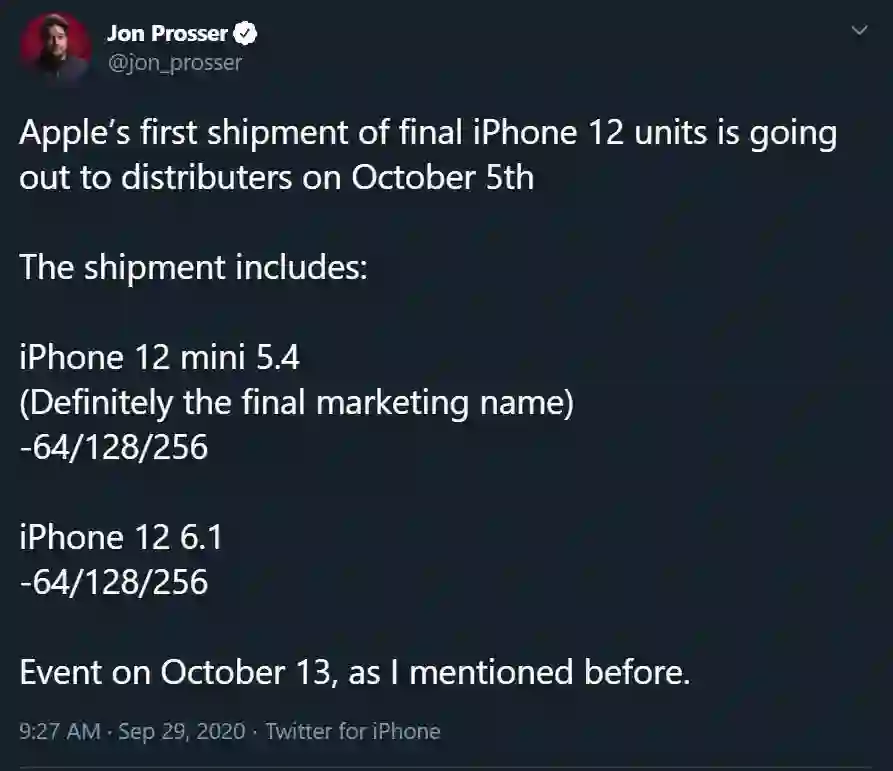 据消息人士 Jon Prosser 报道,苹果首批 iPhone 12 将于 10 月 5 日向分销商交货,包括 5.4 英寸的 iPhone 12 mini 以及 6.1 英寸的 iPhone 12 手机。据他表示,iPhone 12 mini 将肯定会是 5.4 英寸机型的最终名称。另外,两款产品都会有 64/128/256GB 存储空间可选。