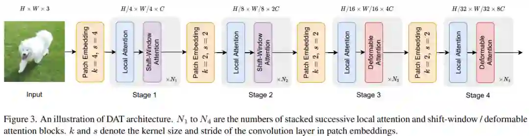 该研究在 Transformer(等式 (4))中的可变形注意力替换了 vanilla MHSA,并将其与 MLP(等式 (5))相结合,以构建一个可变形的视觉 transformer 块。在网络架构方面, DAT 与[7, 26, 31, 36] 共享类似的金字塔结构,广泛适用于需要多尺度特征图的各种视觉任务。如下图 3 所示,形状为 H × W × 3 的输入图像首先被步长为 4 的 4 × 4 非重叠卷积嵌入,然后一个归一化层获得