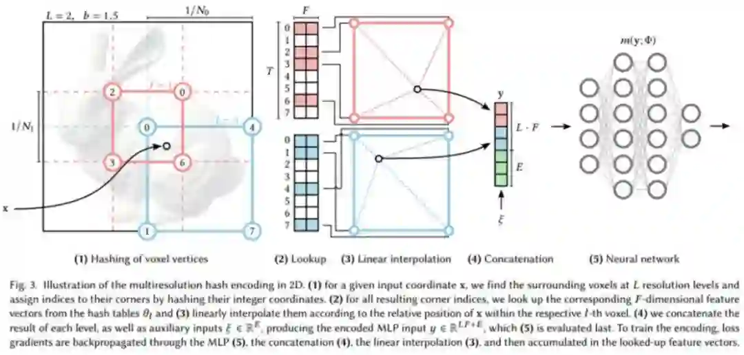 然后是高效性。英伟达的哈希表查找是,不需要控制流。这可以很好地映射到现代 GPU 上,避免了执行分歧和树遍历中固有的指针雕镂(pointer-chasing)。所有分辨率下的哈希表都可以并行地查询。下图 3 展示了多分辨率哈希编码中的执行步骤: