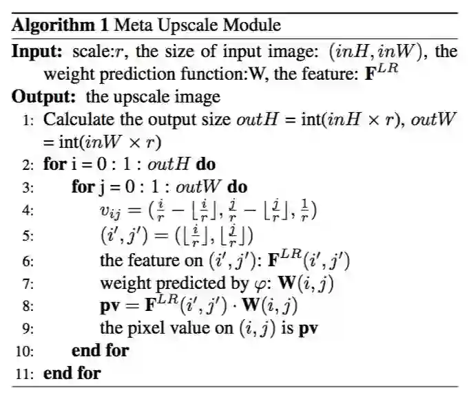 对于待预测 SR 图像上的每个像素点(i, j),本文基于缩放因子 r 将其投射到 LR 图像上,Meta-Upscale 模块把与坐标和缩放因子相关的向量作为输入,并预测得到滤波器权重。对于待预测 SR 图像上的每个像素点(i, j), LR 图像上相应投影点上的特征和预测得到的权重卷积相乘就能预测出(i, j)的像素值。