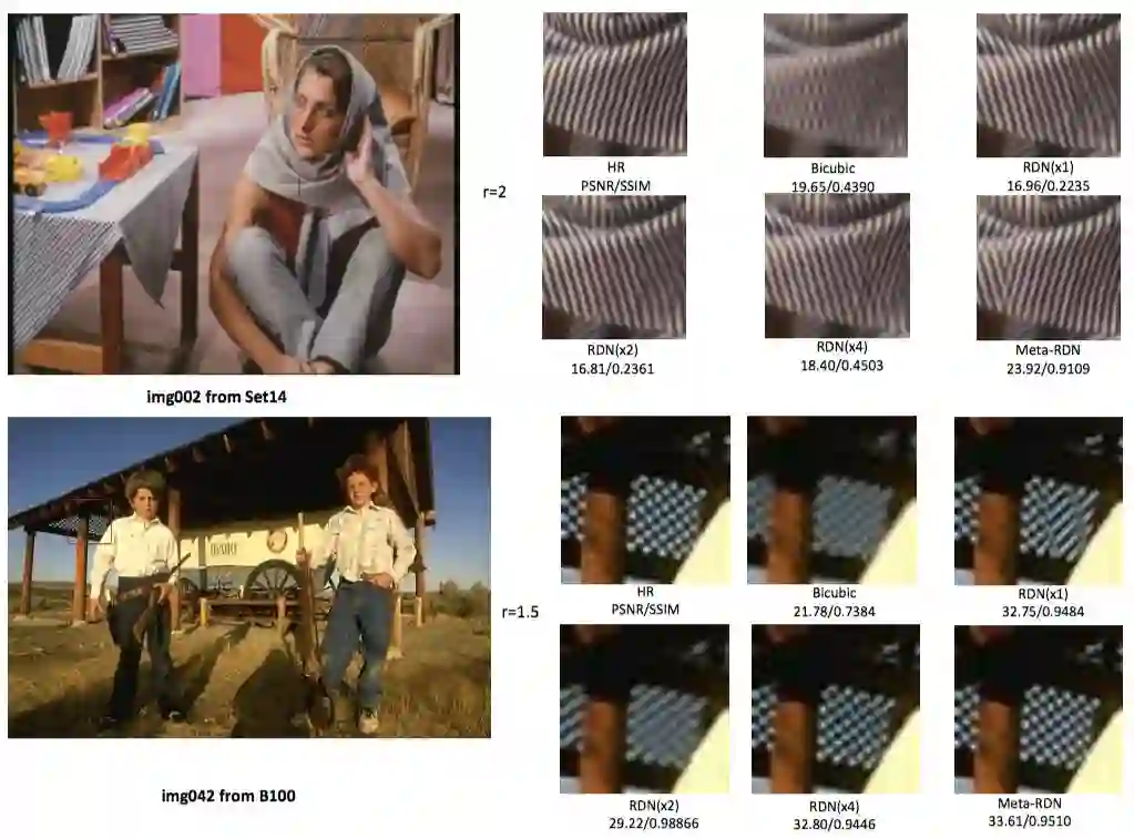 对于 RDN(x4) 和 EDSR(x4),当缩放因子接近 1 时,Meta-RDN 与 RDN(x4) (或者Meta-EDSR 与 EDSR(x4)之间) 存在着巨大的性能差距。此外,当 r>k 时,EDSR(x4) 和 RDN(x4) 不得不在将其输入网络之前放大 LR 图像。
