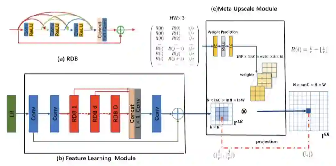 本文选用 RDN 作为特征学习模块,如图 1(b)所示。这里,本文聚焦于 Meta-Upscale 的公式化建模。