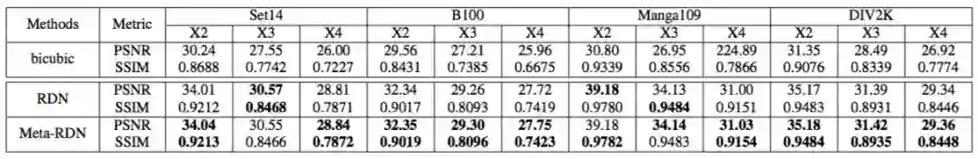 表 3:当缩放因子为X2, X3, X4,Meta-RDN与 RDN 的对比结果。