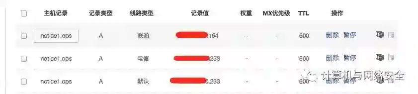 在"线路类型"这里,默认与电信线路都解析到高防的电信里,联通就解析到联通里,TTL时间最好能短一些,如果有问题可以快速切换,但由于我这个是免费dnspod,所以只能是600秒了。