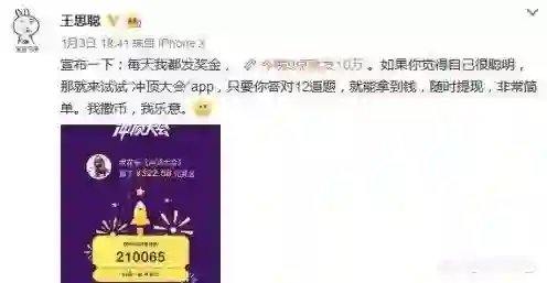 1月3日,是王思聪30岁生日,当晚他宣布拿出10万元给一款名为冲顶大会的App当作奖金,并且说到:“我撒币,我乐意”,并附上自己在冲顶大会App中赢得322.58元奖金的截图。随着王思聪一条博文的呈现,以“冲顶大会”为首的知识竞赛类直播,已成行业新风口。