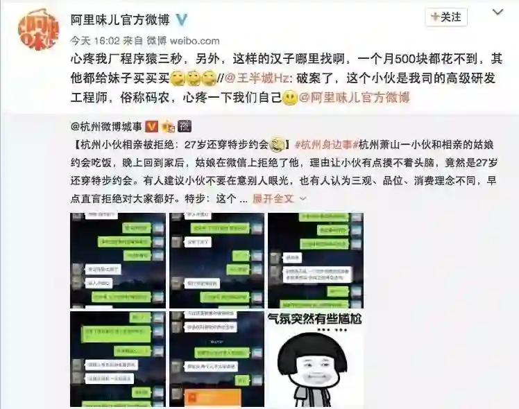 近日,认证为阿里巴巴官方文化账号的@阿里味儿官方微博表示,这个被拒绝的小伙是阿里巴巴的高级研发工程师。