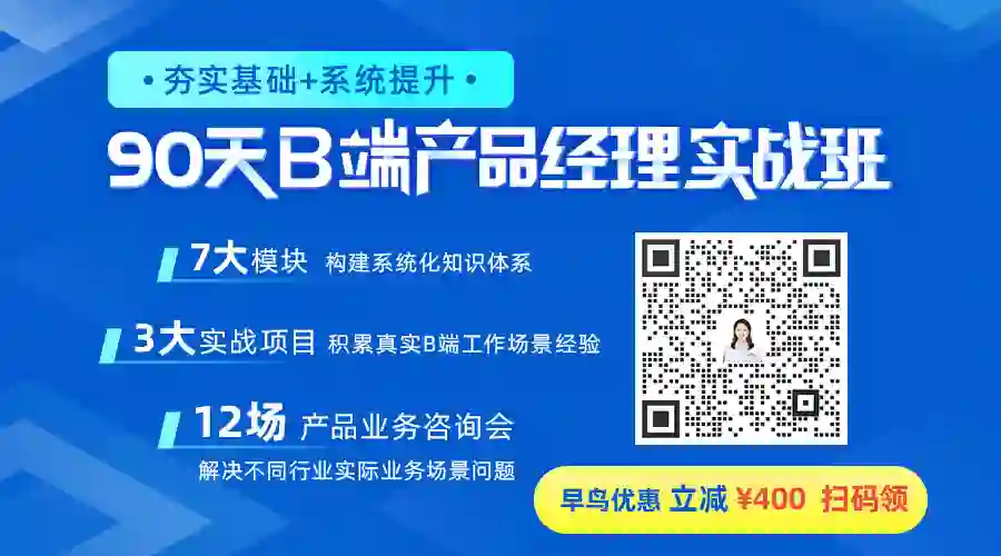 向你推荐《90天B端产品经理实战班》,带你掌握系统的B端产品工作方法,助你实现转岗&提升专业能力,实现涨薪小目标。