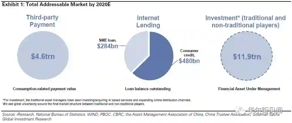 高盛指出,目前在支付、信贷和投资三大传统金融领域,仍有大量潜在用户等待金融创新企业的发掘。