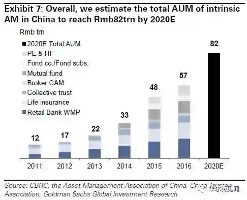 在投资领域当中,高盛预计中国资产管理总规模将从2016年的57万亿人民币(其中16万亿为银行提供的表外理财产品,与储蓄产品相似),增长至2020年的82万亿人民币,中国家庭快速的财富积累和对金融资产更高比例的投入都将是这一增长的驱动因素。