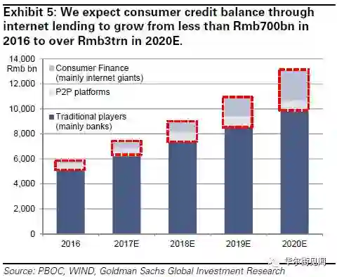 据高盛预计,消费者信贷未结清余额(除住房贷款外)将从2016年的5.8万亿人民币,增长到2020年的13万亿人民币;其中网络借贷将从2016年的6910亿人民币,增长到2020年的3.3万亿人民币,扩张逾4.7倍。新扩张的网络借贷业务将集中在:1) 次贷借款人的提现和消费贷款; 2) 小额消费贷款。