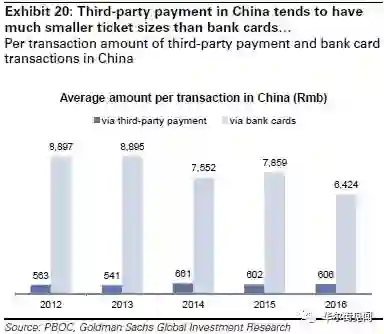 在中国,传统银行卡已经退居为大件交易的支付途径,平均单笔交易额为6424人民币;而第三方支付单笔交易额平均为606人民币,前者是后者的将近十倍。