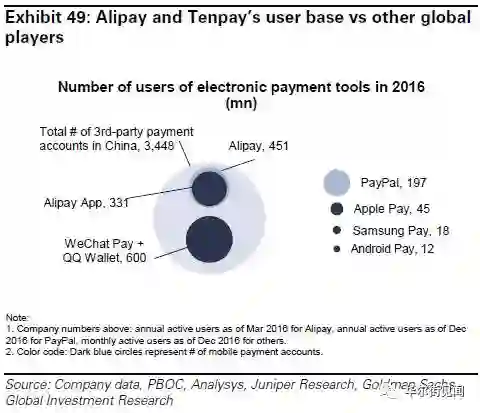 支付宝和财付通用户体量(左)与海外同行竞争对手的体量比较
