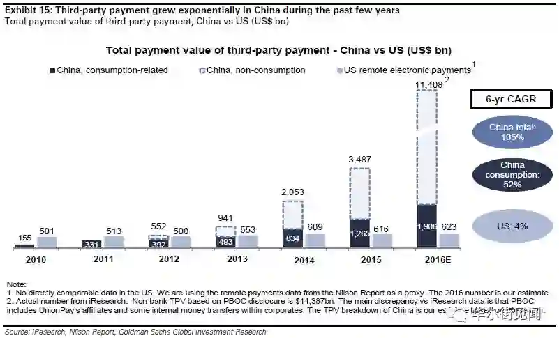 中国第三方支付规模从2010到2016年“从无到有”,反超美国同行规模并将其远远甩在了后面