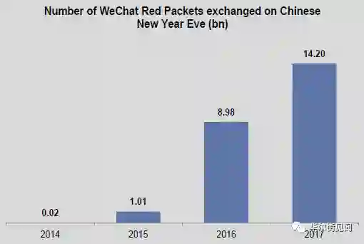 2017年春节期间,共有140亿份现金红包通过微信支付平台送至千家万户。
